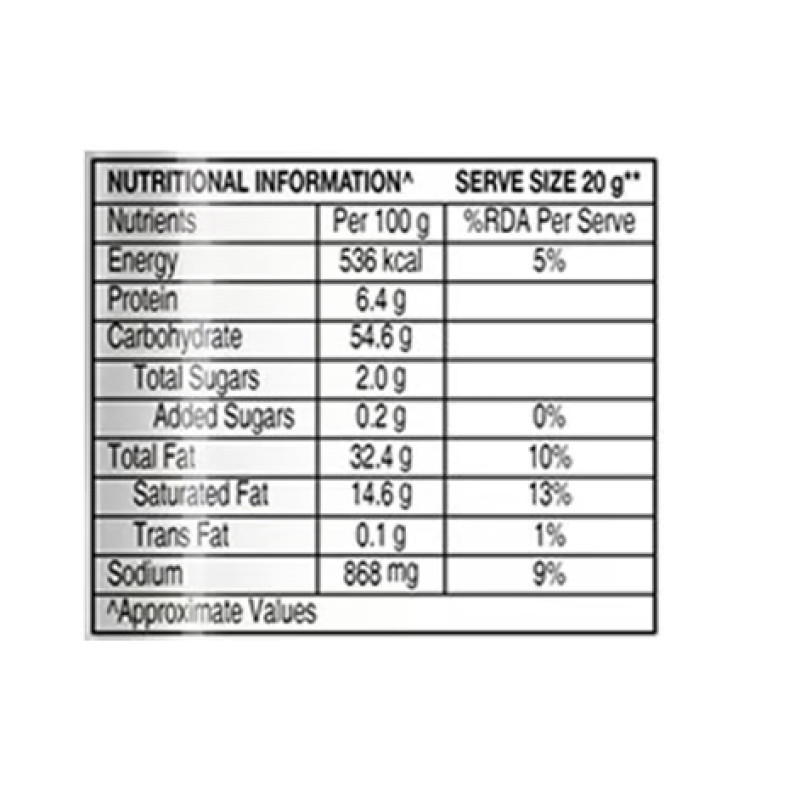 Potato, Edible Vegetable Oil (Palmolein), *Seasoning (Sugar, Iodised Salt, ~Spices & Condiments, Acidity Regulators (330, 334, 296), Matodextrin, Edible Starch, Salt Substitute (Potassium Chloride), Milk Solids, Anticaking Agents (551, 470), Flavour Enhancers (631, 627), Color (150d), Flavour (Natural and Nature Identical Flavouring Substances), Modified Starch (1450)).