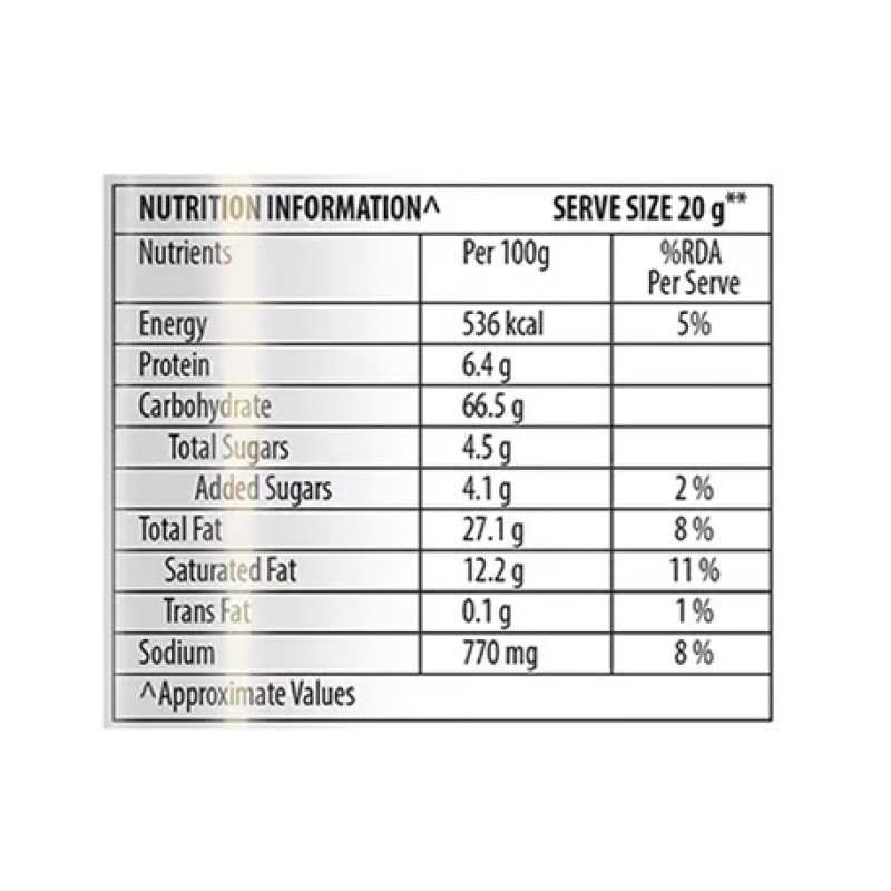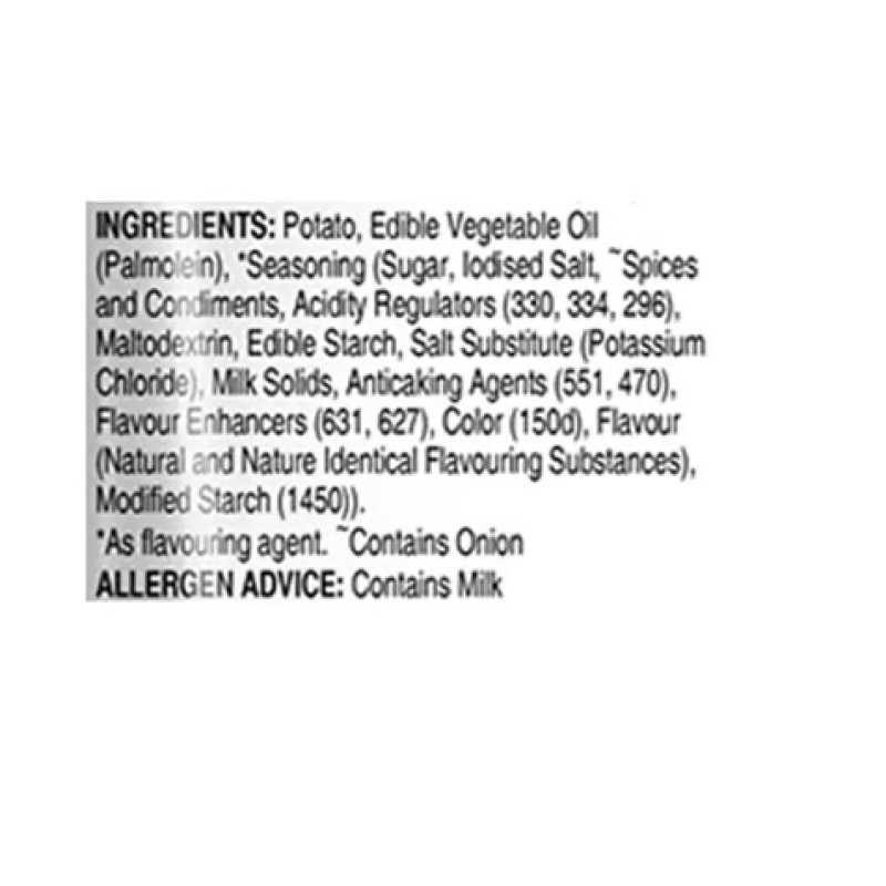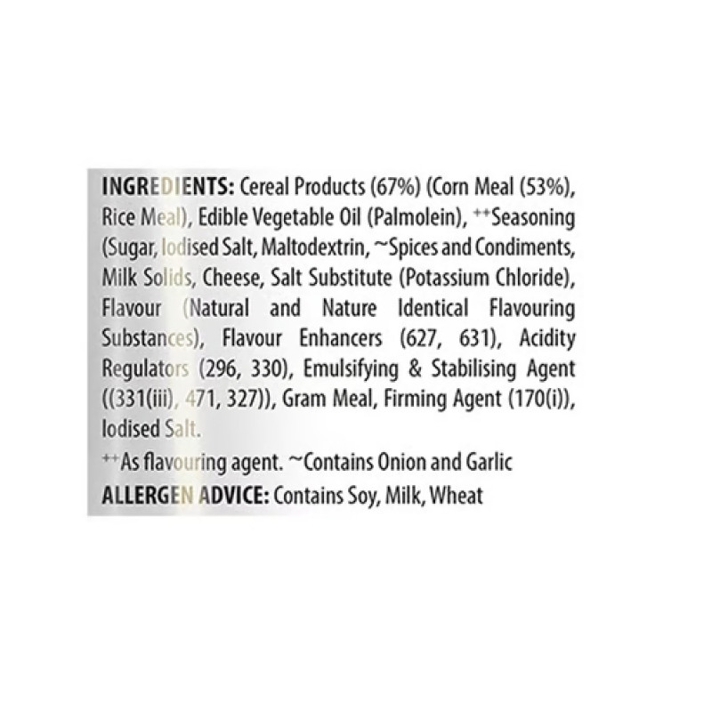 Cereal Products (67%) (Corn Meal (53%), Rice Meal), Edible Vegetable Oil (Palmolein), ++Seasoning (Sugar, lodised Salt, Maltodextrin, ~Spices and Condiments, Milk Solids, Cheese, Salt Substitute (Potassium Chloride), Flavour (Natural and Nature Identical Flavouring Substances), Flavour Enhancers (627, 631), Acidity Regulators (296, 330), Emulsifying & Stabilising Agent ((331(iii), 471, 327)), Gram Meal, Firming Agent (170(i)), lodised Salt. ++ As flavouring agent. ~Contains Onion and Garlic