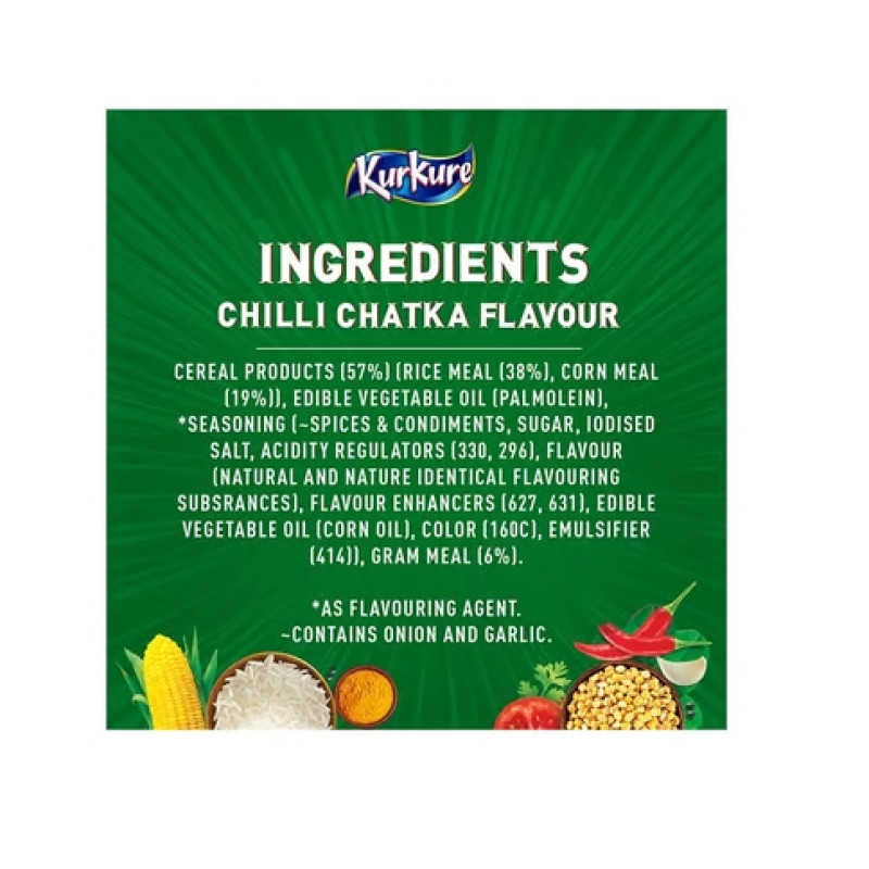 Cereal products (57%) (rice meal (38%), corn meal (19%)), edible vegetable oil (palmolein), *seasoning (~spices & condiments, sugar, iodised salt, acidity regulators (330, 296), flavour (natural and nature identical flavouring substances), flavour enhancers (627, 631), edible vegetable oil (corn oil), colour (160c), emulsifier (414)), gram meal (6%).