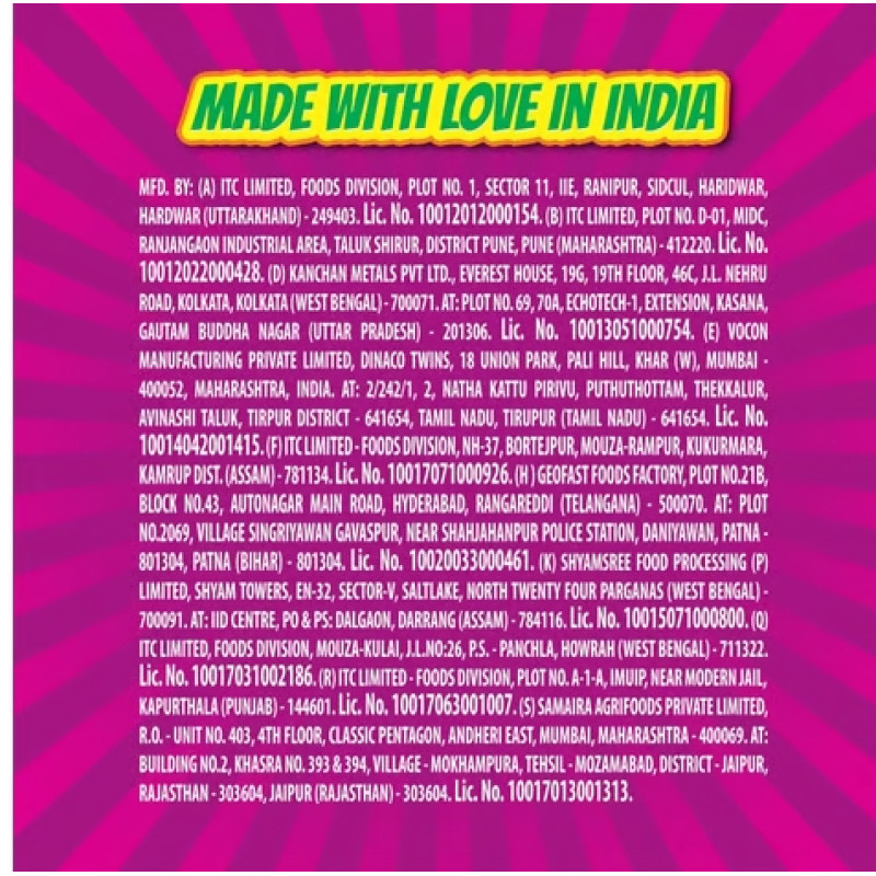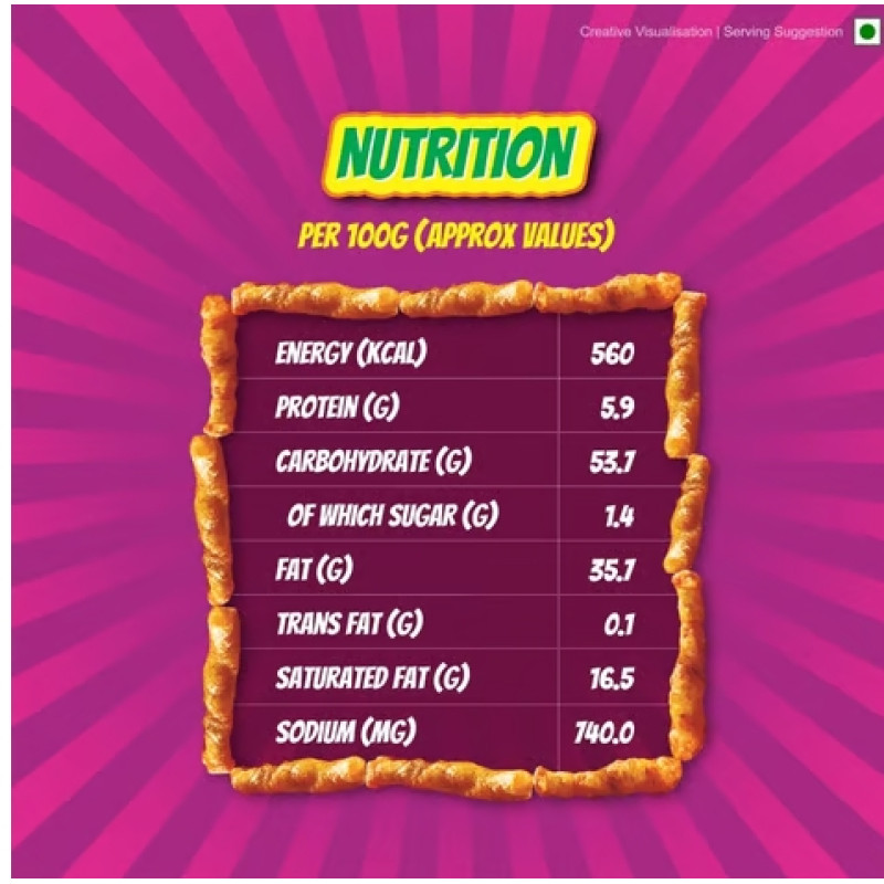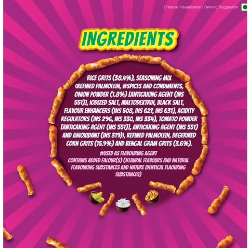 Rice Grit, Edible Vegetable Oil, Gram gmrit, Corn Grit, Onion Powder, (2.8%), Iodised Salt, (1.7%), Chilli Powder (1.1%), Spices & Condiments (0.6%), Black Salt, Coriander Powder (0.2%), Maltodextrin, Acidity Regulators, Dehydrated Vegetable Powder, Refined Sugar (0.1%), Giner Powder (0.2%), Hydrolyzed Vegetable Protein, Anticaking Agent, Flavour Enhancers & Antioxidant