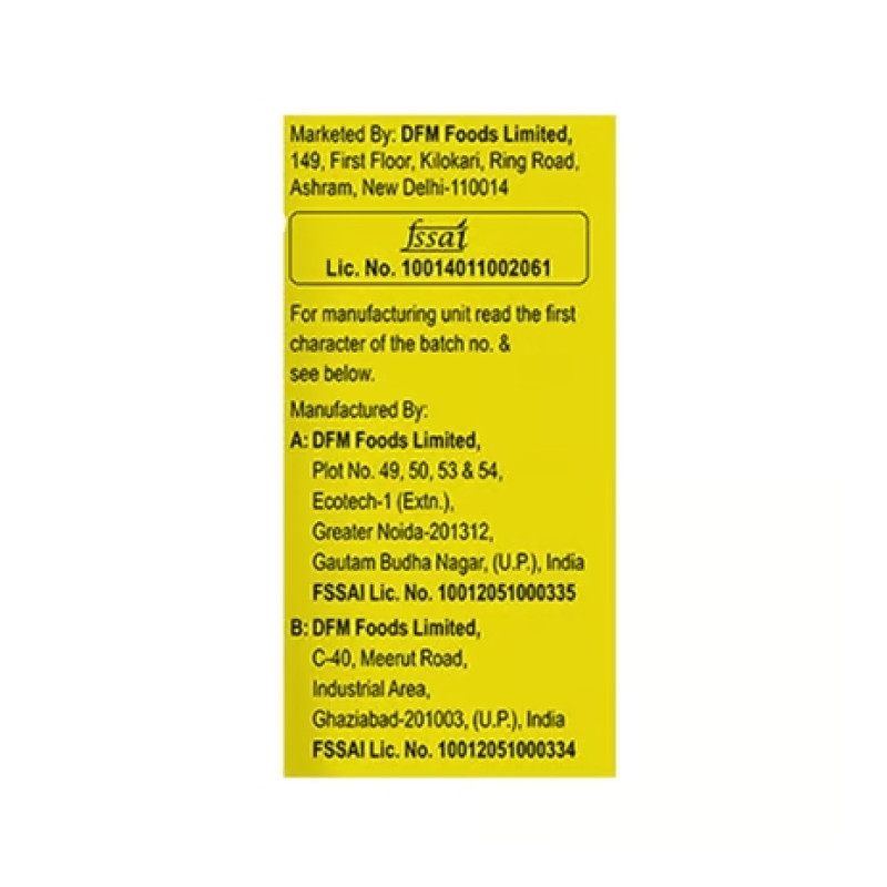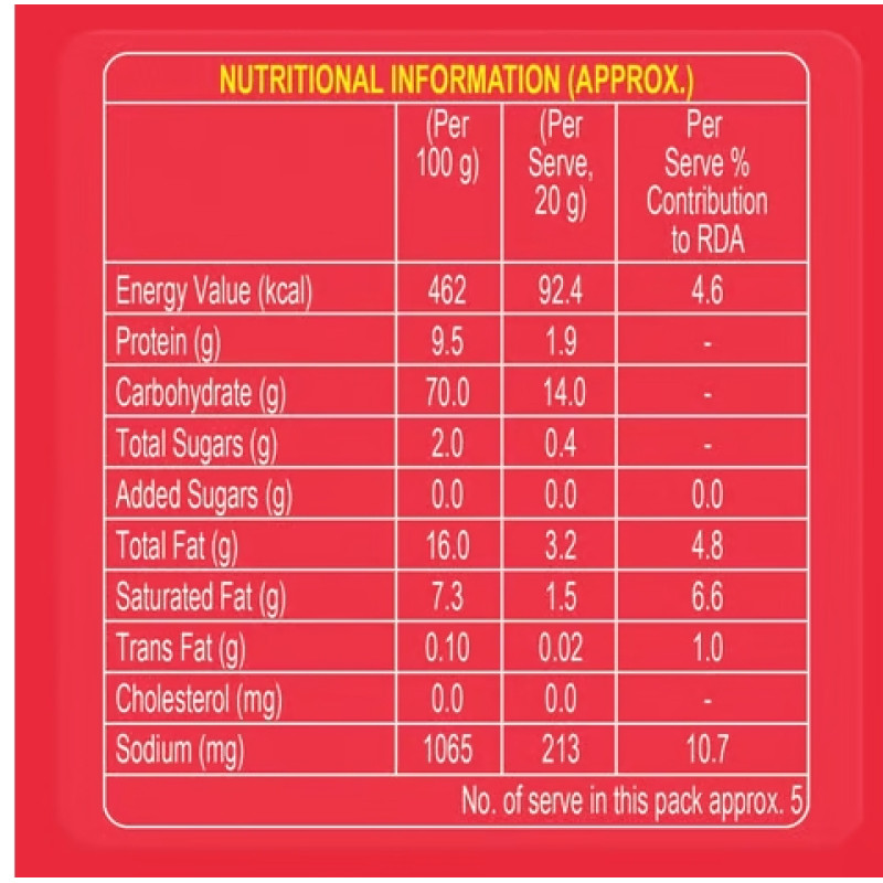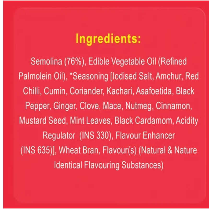 Semolina (76%), Edible Vegetable Oil (Refined Palmolein Oil), 'Seasoning [iodised Salt, Amchur, Red Chilli, Cumin, Coriander, Kachari, Asafoetida, Black Pepper, Ginger, Clove, Mace, Nutmeg, Cinnamon, Mustard Seed, Mint Leaves, Black Cardamom, Acidity Regulator (INS 330), Flavour Enhancer (INS 635)], Wheat Bran, Flavour(s) (Natural & Nature Identical Flavouring Substances).