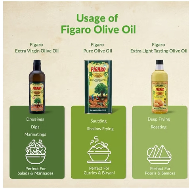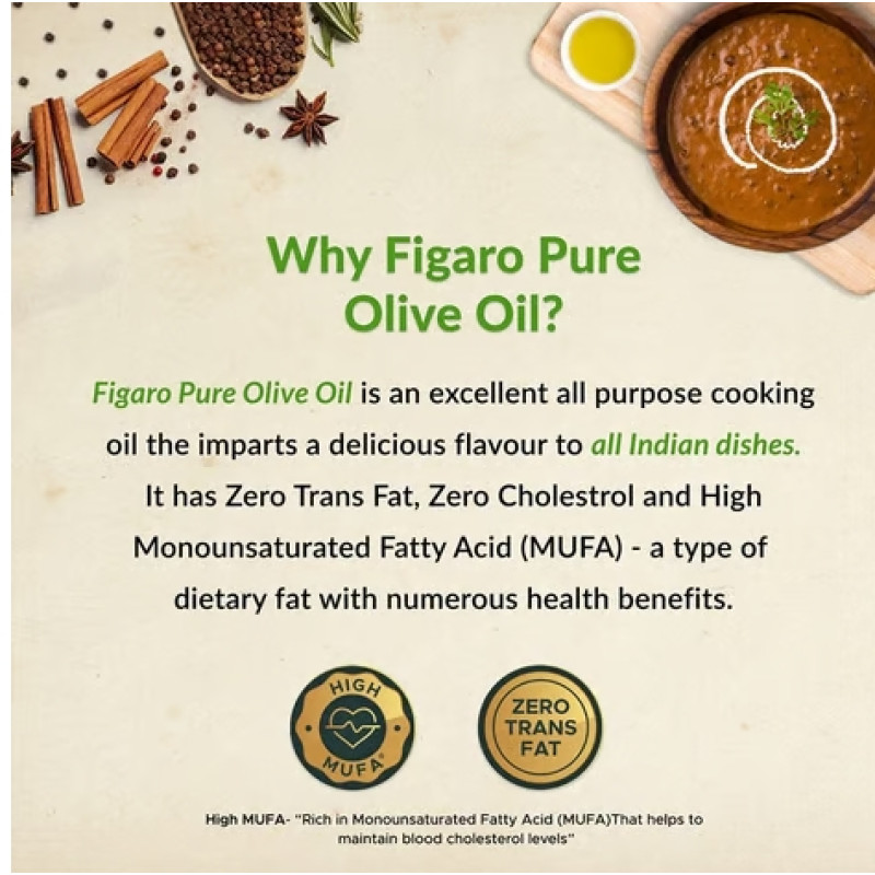 Figaro Olive Oil is a rich blend of extra virgin and refined olive oil that adds a mild and pleasant aroma to your dishes, Olive oil contains high amounts of monounsaturated fatty acids and antioxidants that are beneficial for your health, This oil prevents strokes and inflammation in the body and reduces the risk of heart diseases, Use it for making salad dressings, stir-frying, roasting, sautéing, and shallow-frying foods.