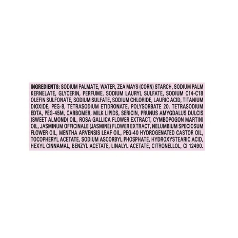 Sodium Palmate, Sodium Palm Kernelate, Water, Talc, Glycerin, Perfume, Sodium Chloride, Titanium Dioxide, Lauric Acid, PEG-8, Polysorbate 20, Tetrasodium Etidronate, Milk Lipids, Tetrasodium EDTA, Sericin, Prunus Amygdalus Dulcis (Sweet Almond) Oil, Rosa Gallica Flower Extract, Cymbopogon Martini Oil, Jasminum Officinale (Jasmine) Flower Extract, Nelumbium Speciosum Flower Oil, Mentha Arvensis Leaf Oil, PEG-40 Hydrogenated Castor Oil, Methylchloroisothiazolinone, Methylisothiazolinone, Tocopheryl Acetate, Alpha-isomethyl Ionone, Benzyl Benzoate, Benzyl Salicylate, Citronellol, Coumarin, Eugenol, Geraniol, Linalool, Benzyl Alcohol, CI 12490.