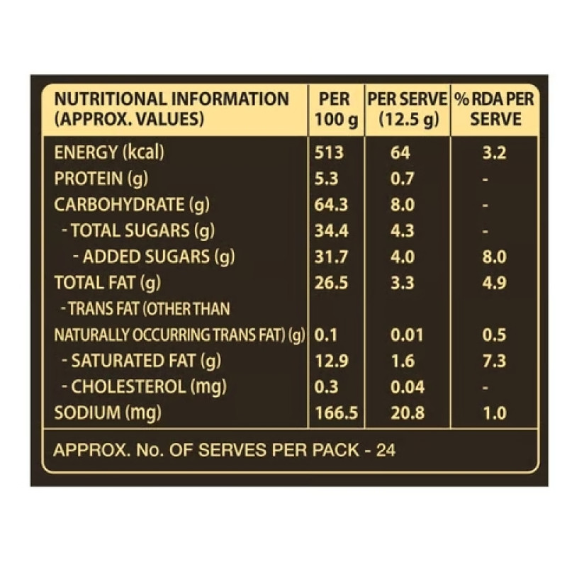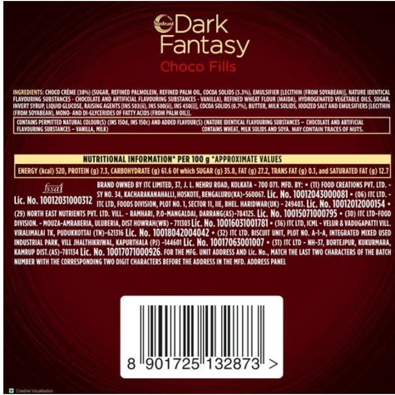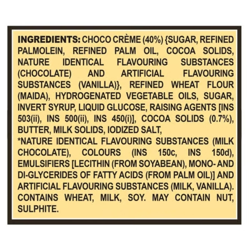 Choco Crème (38%), {Sugar, Refined Palmolein, Refined Palm Oil, Cocoa Solids (5.3%), Emulsifier [Lecothin (From Soyabean)], Nature Identical flavouring substnaces - Chocolate and Artificial flavouring substnaces - Vanilla}, Refined wheat flour (Maida), Hydrogenated vegetable oils, Sugar, Invert syrup, Liquid Glucose, Raising Agents [INS 503(ii), INS 500(ii), INS 450(i)], Cocoa Solids (0.7%), Butter, Milk Solids, Iodized Salt and Emulsifiers [Lecithin (From soyabean), Mono-and Di-Glycerides of fatty acids (from Palm oil)].