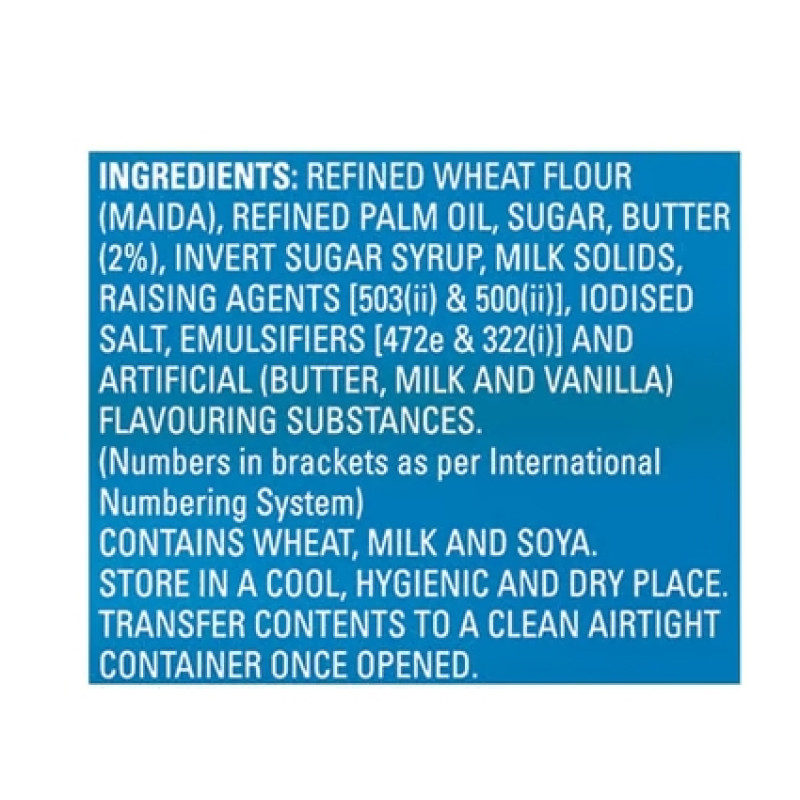 Refined Wheat Flour, Sugar, Edible Vegetable Oil, Butter (3%), Invert Syrup, Milk Solids, Raising Agents, Edible Common Salt, Emulsifiers (322, 471)