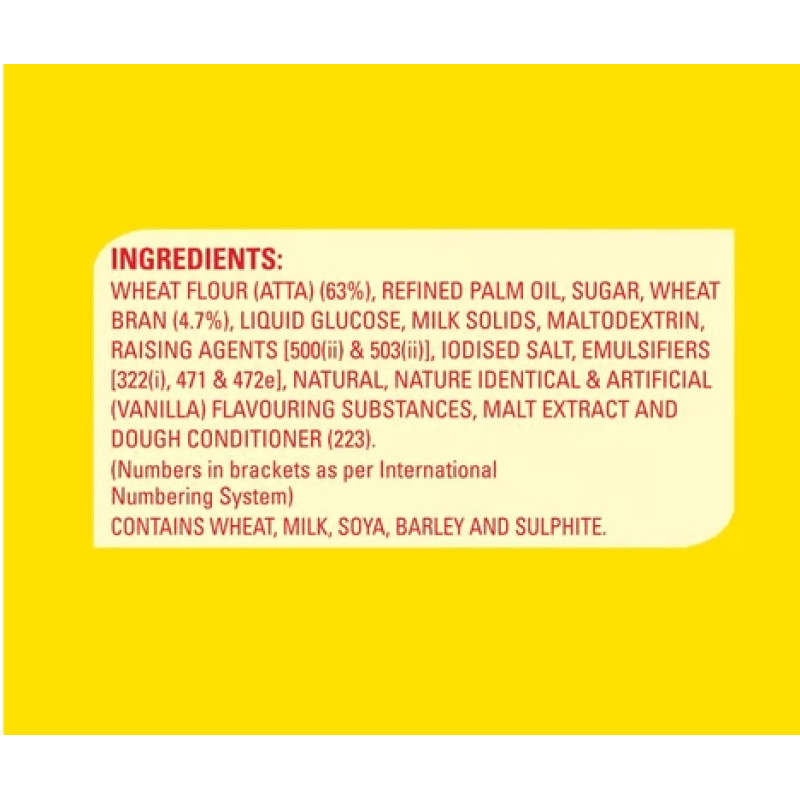 Prepared using Refined Wheat Flour, Whole Wheat Flour, Edible Vegetable Oil (Palm), Sugar, Wheat Bran, Liquid Glucose, Milk Solids, Maltodextrin, Raising Agents, Iodised Salt, Emulsifiers, Malt Extract and Dough Conditioner