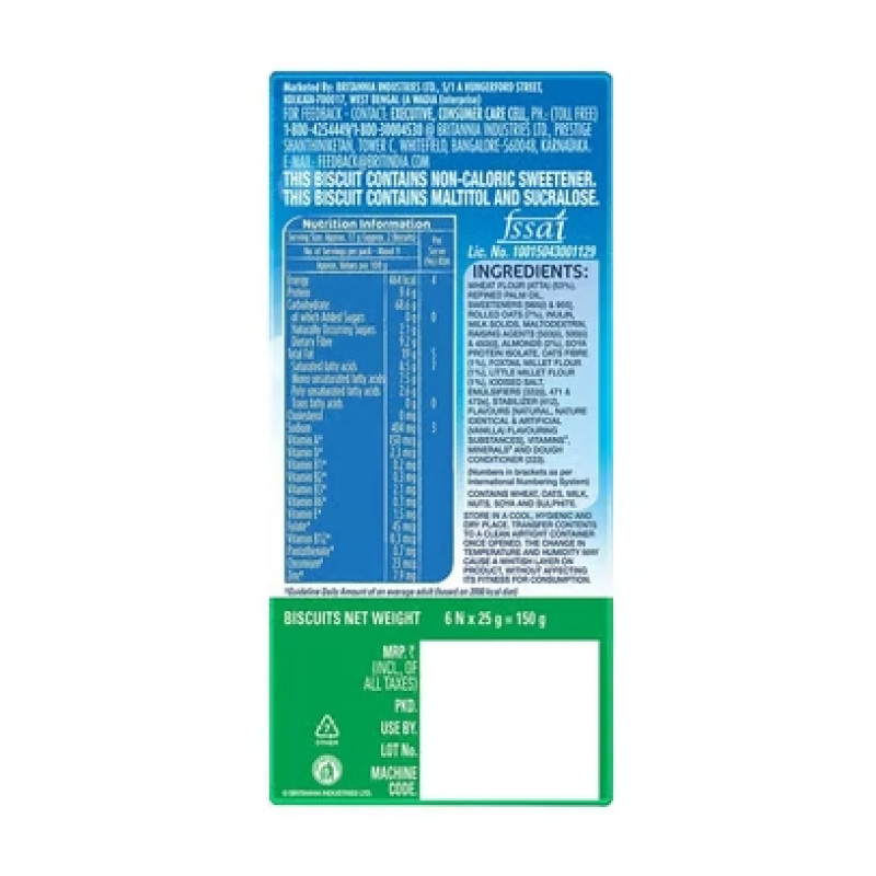 Prepared using Refined Wheat Flour, Edible Vegetable Oil (Palm), Maltitol, Inulin, Rolled Oats, Milk Solids, Natural Cereal Fibre, Almond, Maltodextrin, Raising Agents, Iodised Salt, Emulsifiers, Dough Conditioner and Sweetener