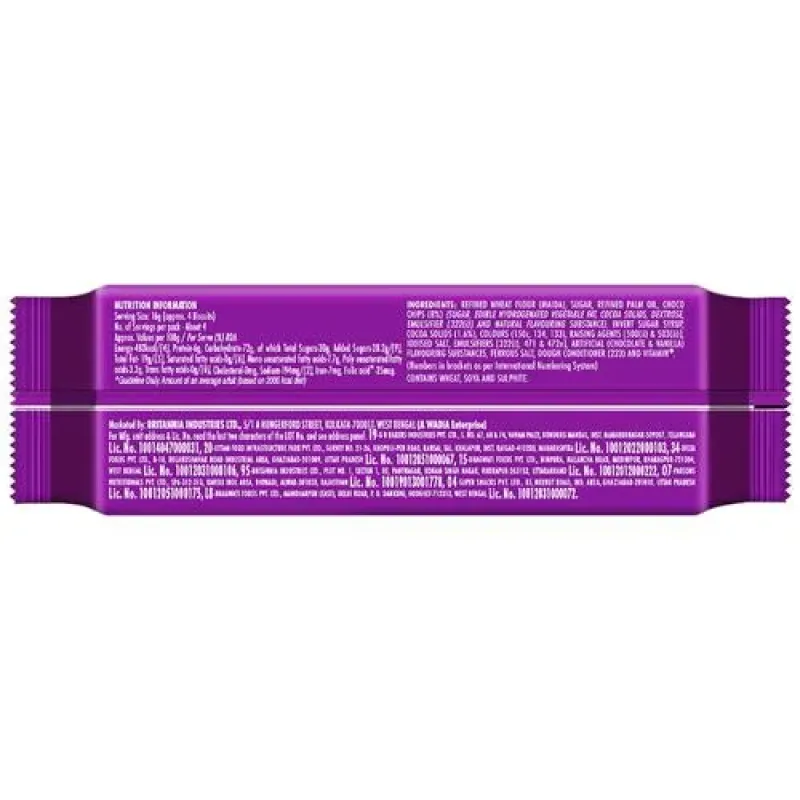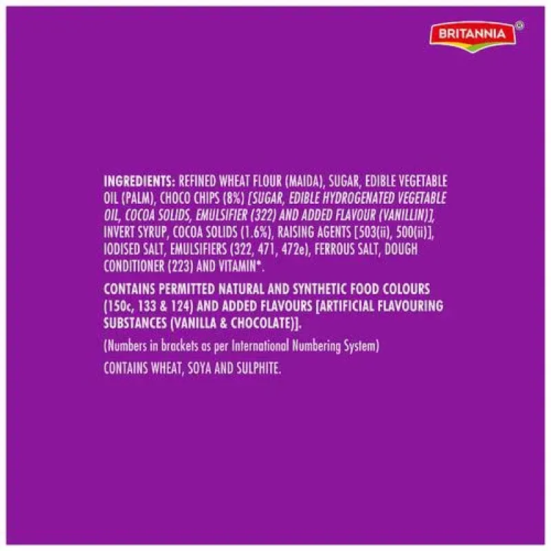 Refined Wheat Flour (Maida), Sugar, Edible Vegetable Oil (Palm), Choco Chips (Sugar, Edible Hydrogenated Vegetable Oil, Cocoa Solids, Emulsifier and Added Flavour (Vanillin)), Invert Syrup, Cocoa Solids, Raising Agents, Iodised Salt, Emulsifiers, Ferrous Salt, Dough Conditioner and Vitamin, Artificial