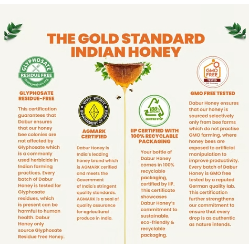Dabur honey conforms strictly with all the 22 parameters mandated by FSSAI for testing honey.