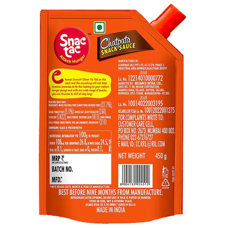 - Product Code: Snac tac Chatpata Snack Sauce 450 g