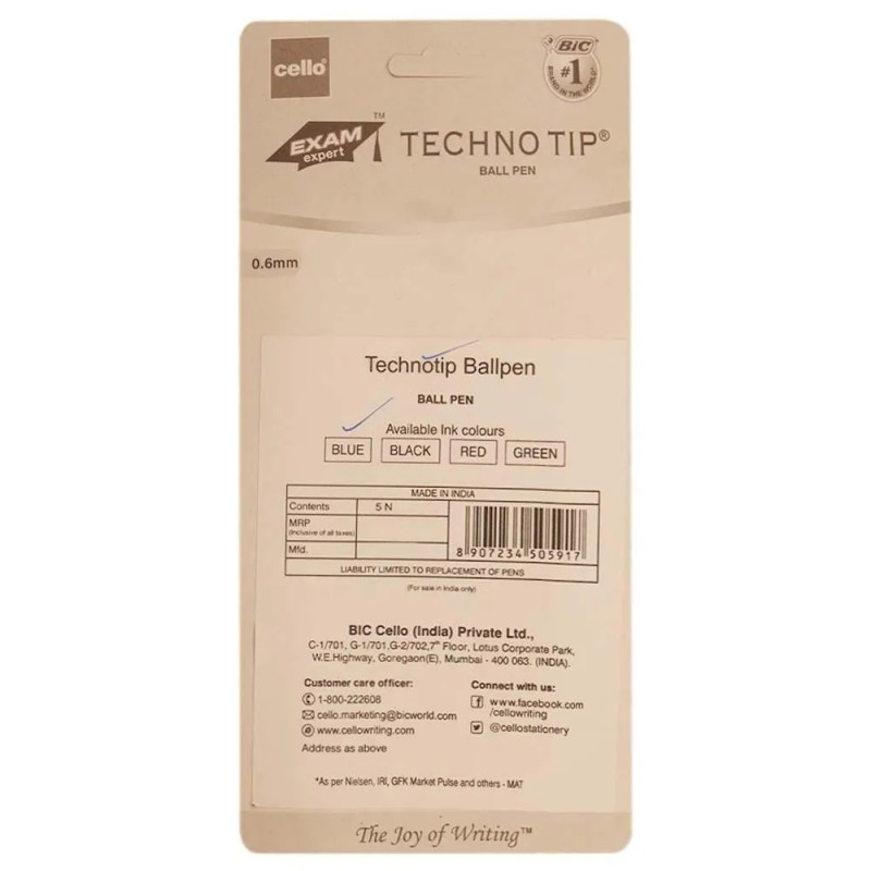 - Product Code: Bic Cello 0.6 mm Techno Tip Blue Ballpoint Pen (Pack of 5)