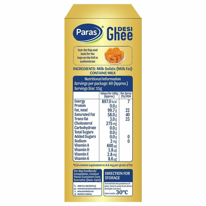 Ghee is a class of clarified butter that originated in ancient India. It is commonly used in Indian cooking. Paras Desi Ghee can be swapped for vegetable oil or coconut oil in baked goods or can be used for deep-frying. Or simply melt it and spread it on roti, or pour it on vegetables/dal before serving. So go ahead and buy this product online today!