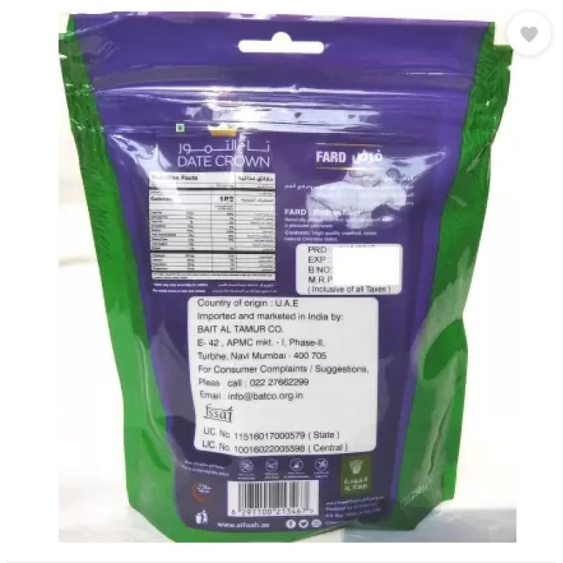 Fard, is a popular brand of Dates in India. It is grown mainly in the eastern region, is characterized by a unique natural, glossy, waxy layer covering its smooth surface, in addition to the strong, fiber structure which gives its lesser sweet taste. The product comes in various packaging sizes.